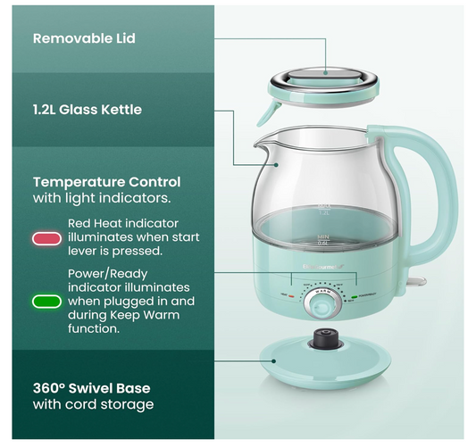 Elite Gourmet EKT1220M Electric BPA-Free Glass Kettle, Temperature Dial, Keep Warm Function, Cordless 360° Base, Blue LED Interior, Auto Shut-Off Function – Quick Boil, Mint, 1.2L